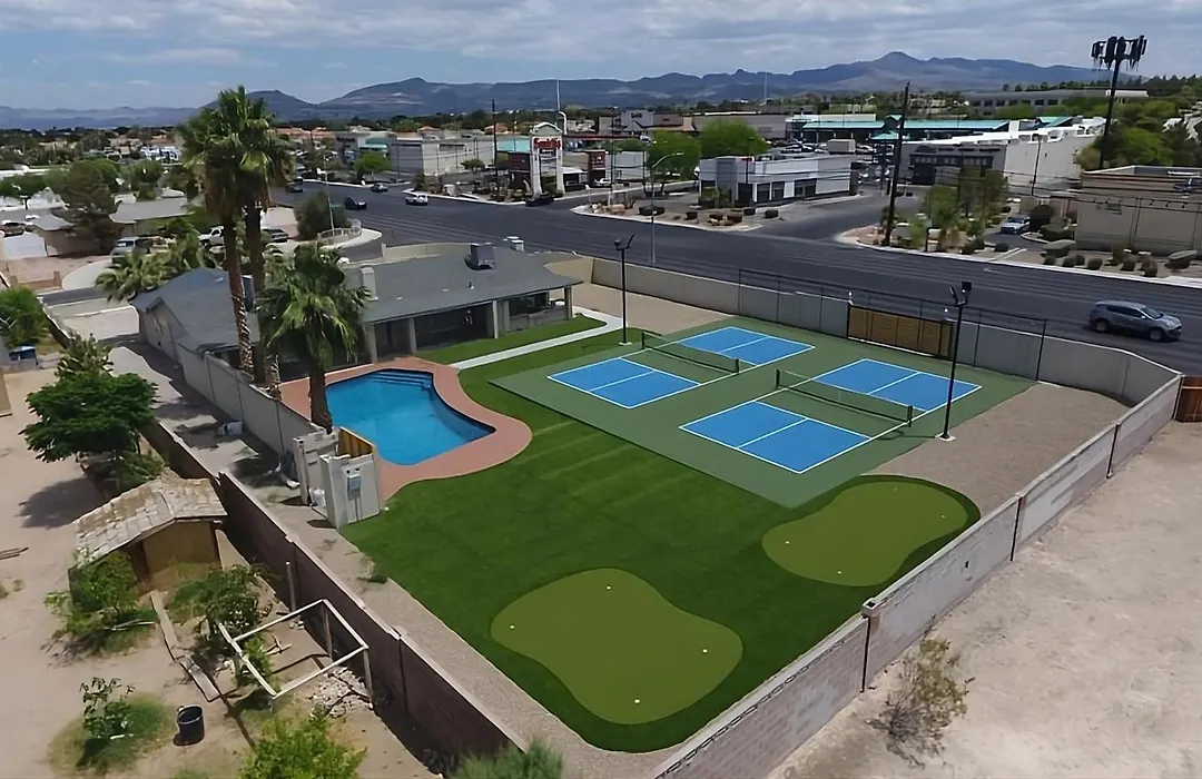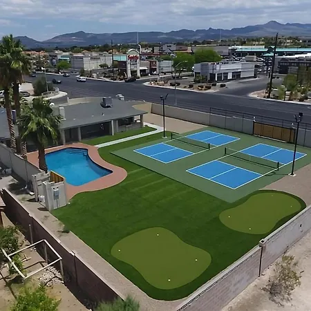 De 2-slaapkamer Elevated Pickleball Retreat Las Vegas villa is binnen 3 km van het Sunset Park Disc Golf Course gelegen en biedt een zwembad, wat zorgt voor een ontspannen verblijf.
